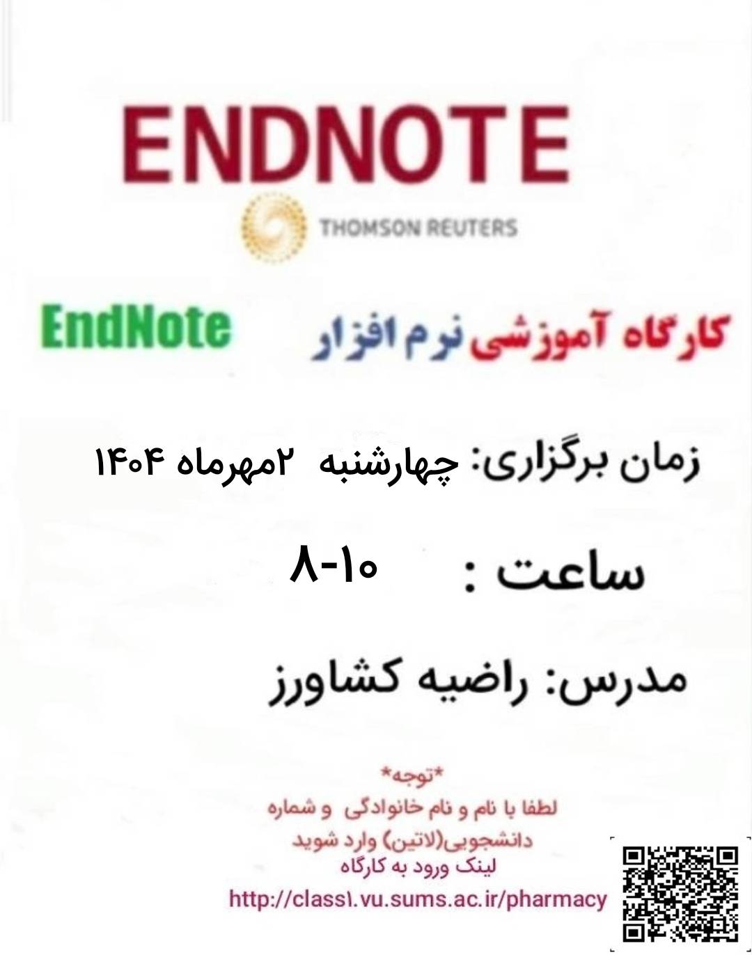 کتابخانه دانشکده داروسازی برگزاری کارگاه آموزشی نرم افزار اندنوت مهر ماه 1404 گروه خبری : اخبار کتابخانه کد خبری : 133305 کپی کلیدواژه